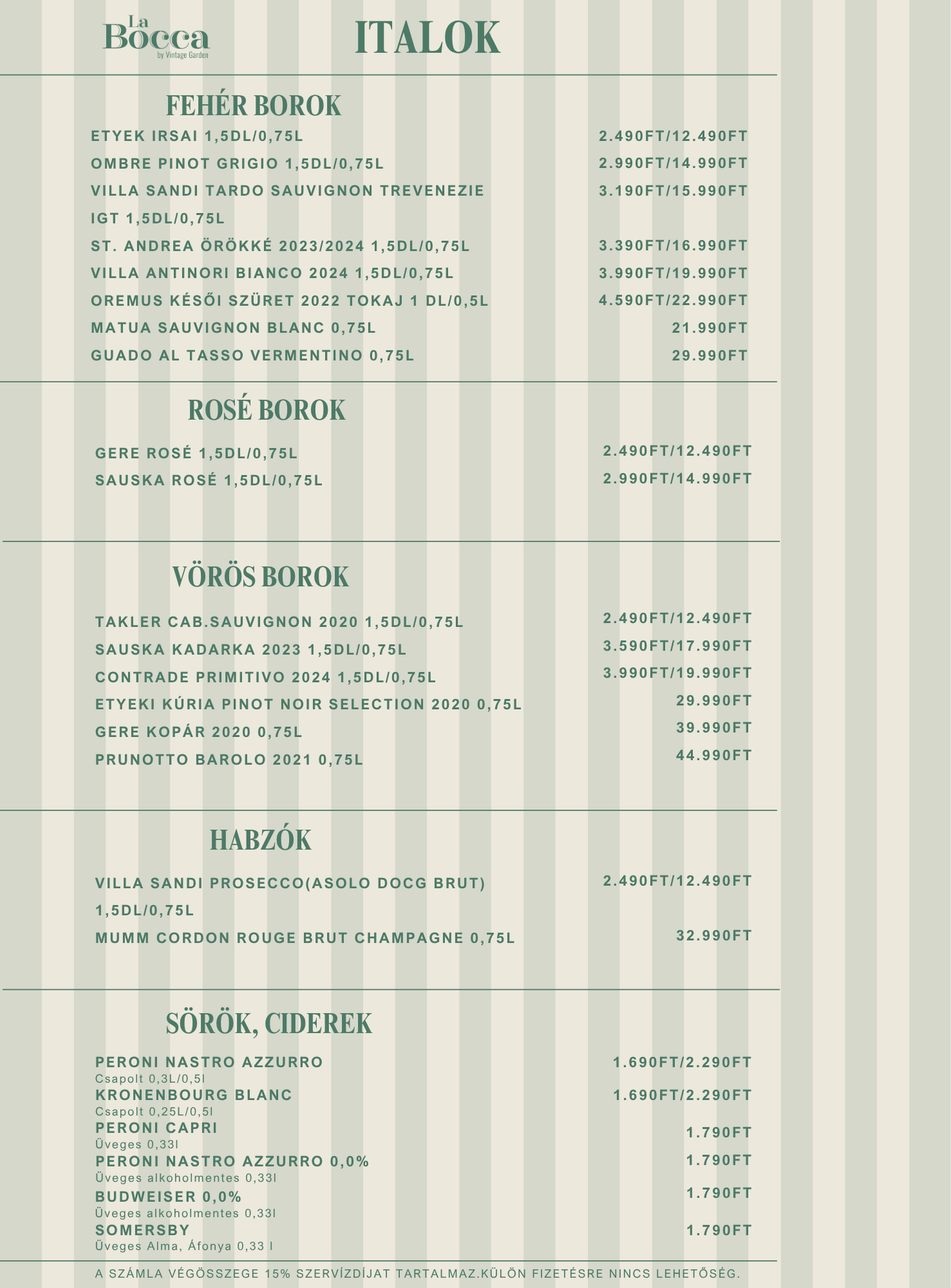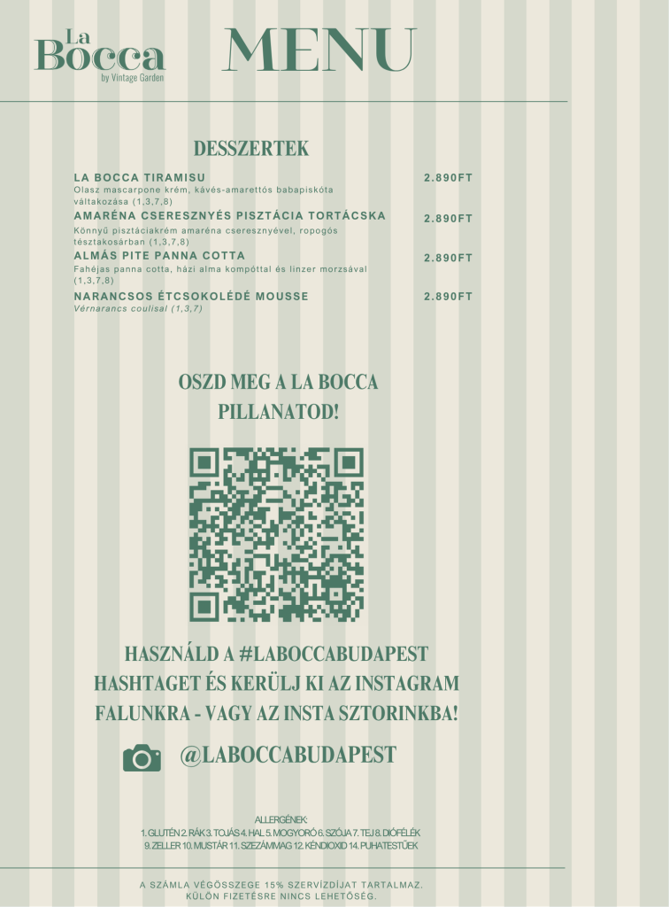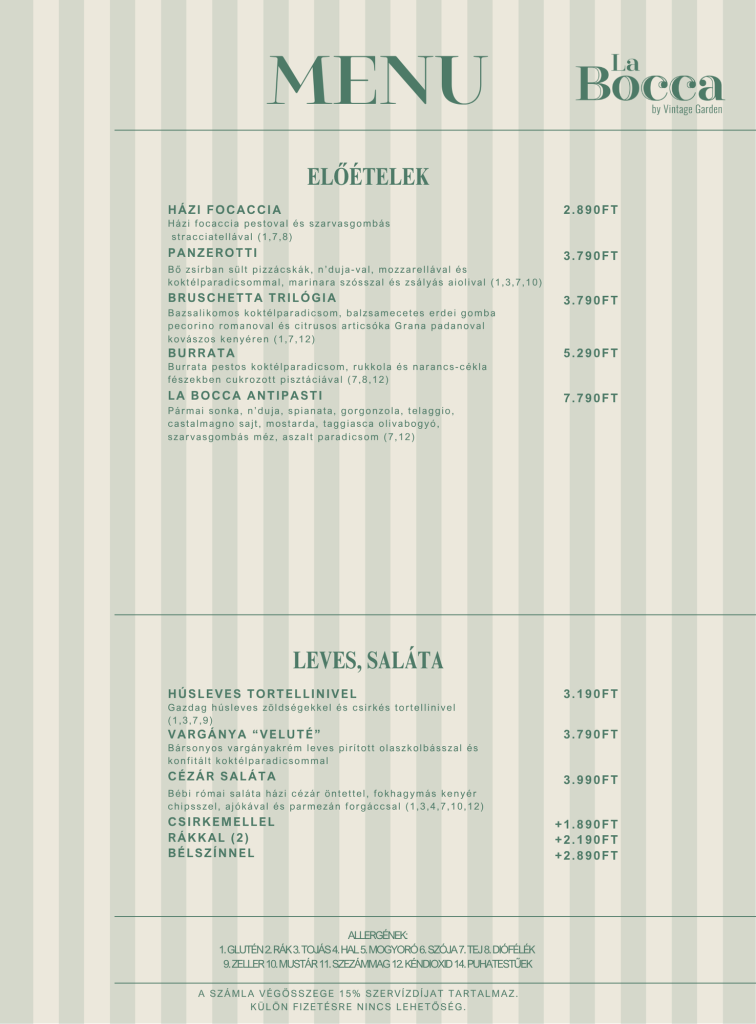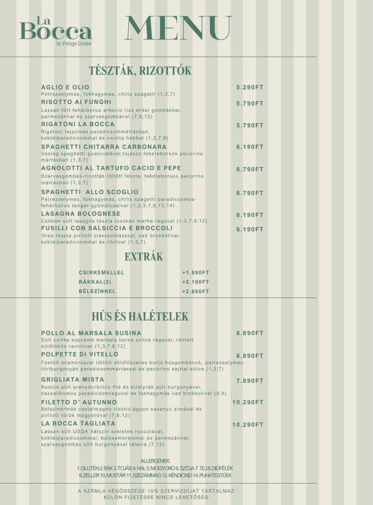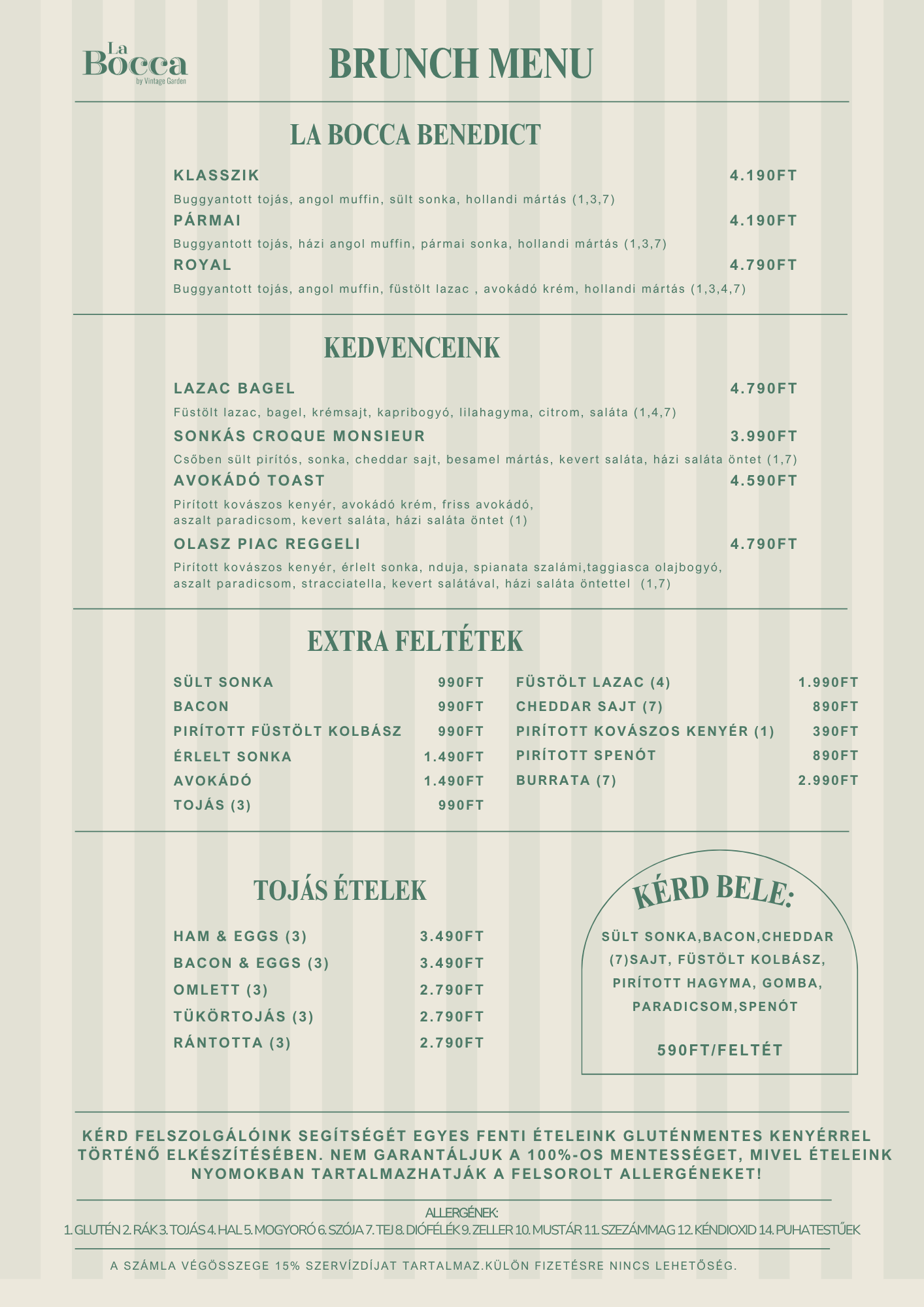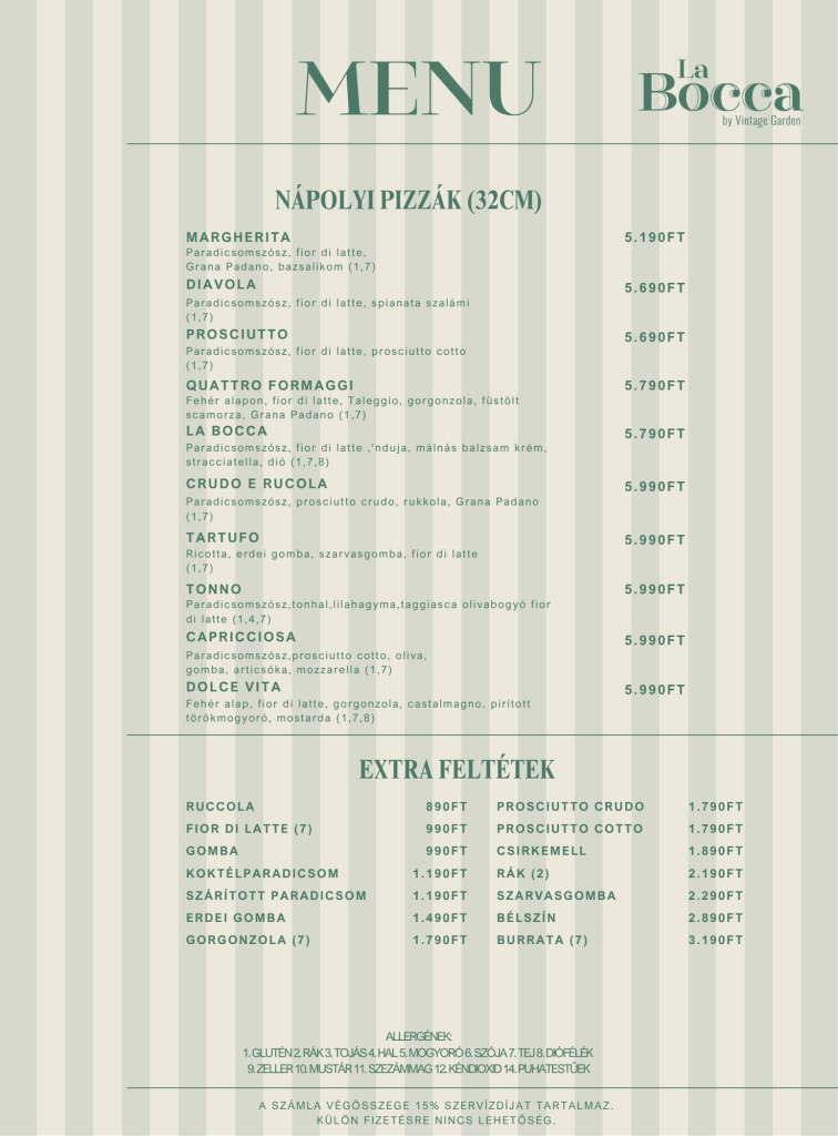 1. Glutén 2. Rák 3. Tojás 4. Hal 5. Mogyoró 6. Szója 7. Tej 8. Diófélék 9. Zeller 10. Mustár 11. Szezámmag 12. Kéndioxid 14. Puhatestűek